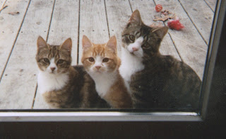 They lived happily with McCovey for a few years before he passed away, and my family and I loved having just 2 cats: Stan [the tabby] and Fergie [the cow cat]. That all changed one fall day during my junior year of high school. My parents' home backs on acres and acres of woods. It's really beautiful and one day, three little faces appeared on our back porch. They were only 6 weeks old and so beautiful. We started putting out food for them, and tried to pet them, but they were very skiddish. After a month or so, it seemed as though two of them said to the third one, "Go check it out! See if these are nice people!" because one of them wanted to come inside. Well, of course we are, and slowly but surely, after Robbie took the first step, Bernie followed him, and Hideki came inside a few weeks after that.