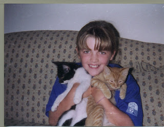 When my parents bought their current home, before I was born, they brought Robin with them [who had been adopted from a pound]. But by the time I was in 2nd grade, Mr. McCovey was our only cat [follow the list above, if you'd like]. We knew we wanted another, and we had never had a orange tabby before. We called our local shelter and they told us that they had an orange tabby that was just brought in. [See, you can usually even pick out a type/color of cat you want at shelters!] We immediately went to see him. He had been found stuck to a tree by his collar and hadn't eat in days before he was brought in. He was soooo skinny, sick, and only 8 weeks old. But I thought he was perfect! The employee took him out of the cage and he came to me immediately. Now here's the fun part, he also shared that cage with the runt of a litter that was born at the shelter. The employee said that no one wanted this cat because he looked like a cow with random black and white spots. We were only supposed to go to the shelter to get the one, orange cat, but when the black and white one jumped into my dad's arms, we knew we had to take both.